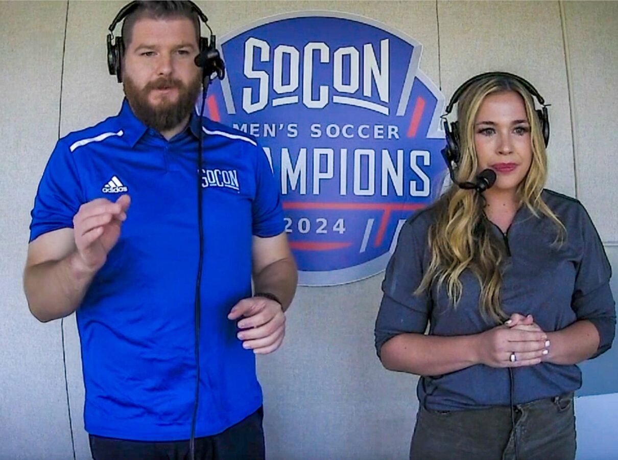 Play-by-play announcer Gabriel Schray, left, and analyst Dr. Heath Thacker call the University of Tennessee at Chattanooga’s women’s basketball game against Mississippi State on ESPN+. Chattanooga would go on to upset the Top 25-ranked Bulldogs that day.